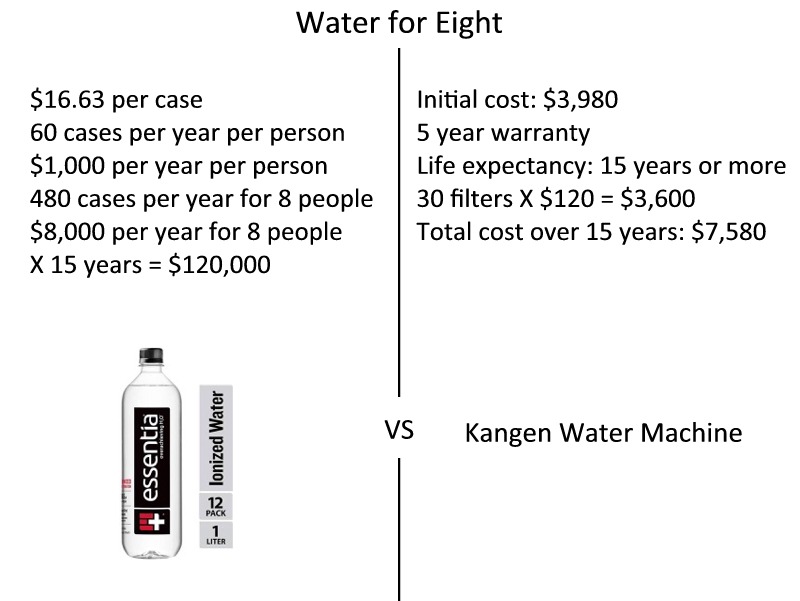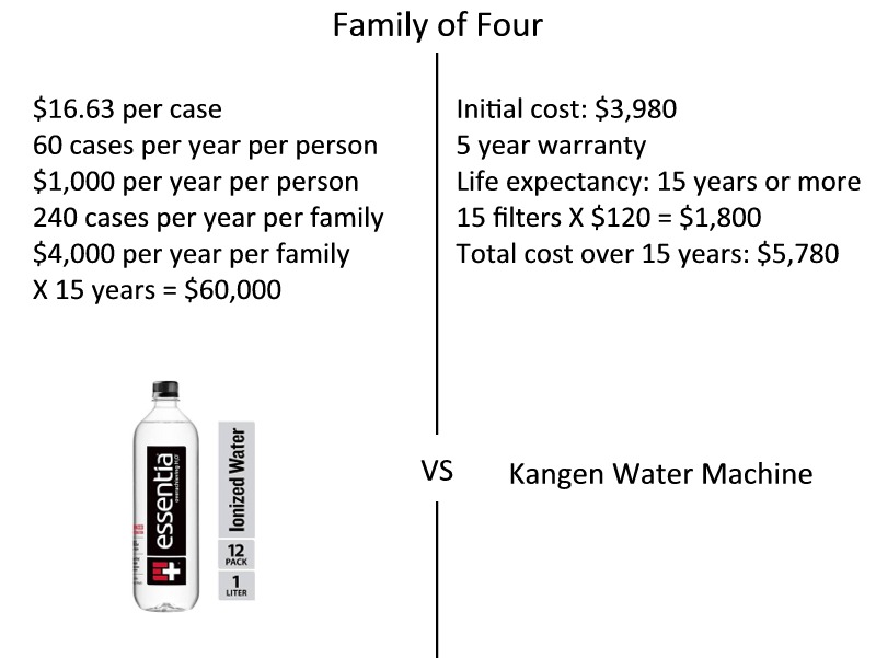 It is a funny movie, in a twisted sort of way. But in real life, arsenic is no laughing matter. That's the reason I found this 2020 article from The Washington Post to be rather disturbing. Here's an excerpt: "Bottled water manufactured by Whole Foods and sold in its U.S. stores contains potentially harmful levels of arsenic — at least three times that of every other brand tested and just shy of the federal cap, according to Consumer Reports."[1] Select the link below to see a report from MSNBC on bottled water. The choice is clear - Kangen Water® is the healthy choice. Bottled Water is Expensive Over time, you can spend a literal fortune on bottled water. Still, let's suppose that someone realized the benefits of drinking alkaline water, but when they heard the price of a Kangen Water® machine blurted out, "I can't afford that. I'll just buy bottled alkaline water from Wal-Mart." Okay, let's look at a scenario. We'll buy Essentia by the case; on sale at Wal-Mart for $16.63 for a case of 12 1 liter bottles. By the way, even though Essentia does have a pH of 9.26, which is close to the Kangen Water®, it's ORP is +179! While that is better than most of the other brands of bottled water, it's nowhere near being in the same class as Kangen Water® with its -745 ORP. Essentia is oxidative - Kangen Water® is a very strong antioxidant (30 times the antioxidant power of green tea). However, we will overlook that detail for now, and do a simple price comparison.