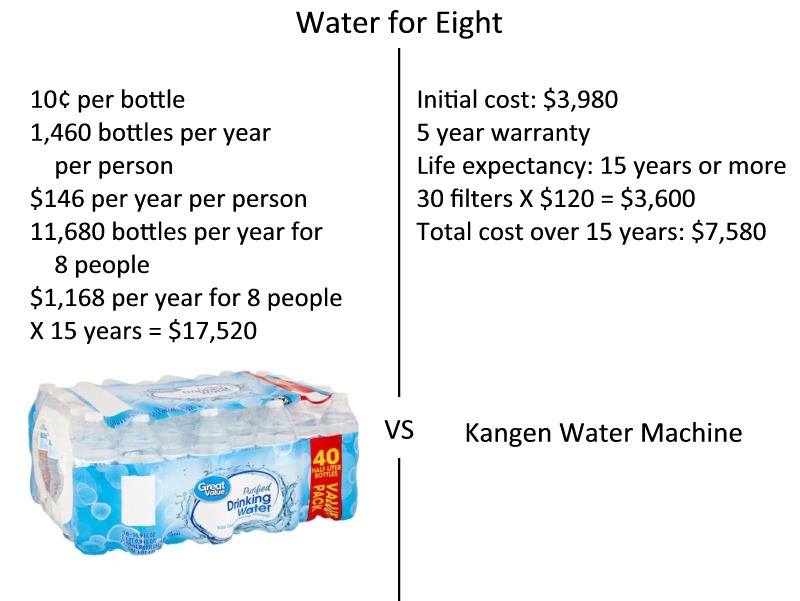 Much more, actually! In fact, the Kangen Water® machine that we have in our kitchen would feel neglected if it only produced enough water for four people. It could just as easily produce water for 40 people over the next 15 years, and I expect realistically over the next 20 or 25 years or more. Considering the potential of the quantity of the best water on earth that our machine can produce, the real value is inestimable. But, for the sake of comparison to buying bottled water, let's consider another scenario. Suppose you wanted to supply good water for your parents or some other family members, so the total number of people came to eight.